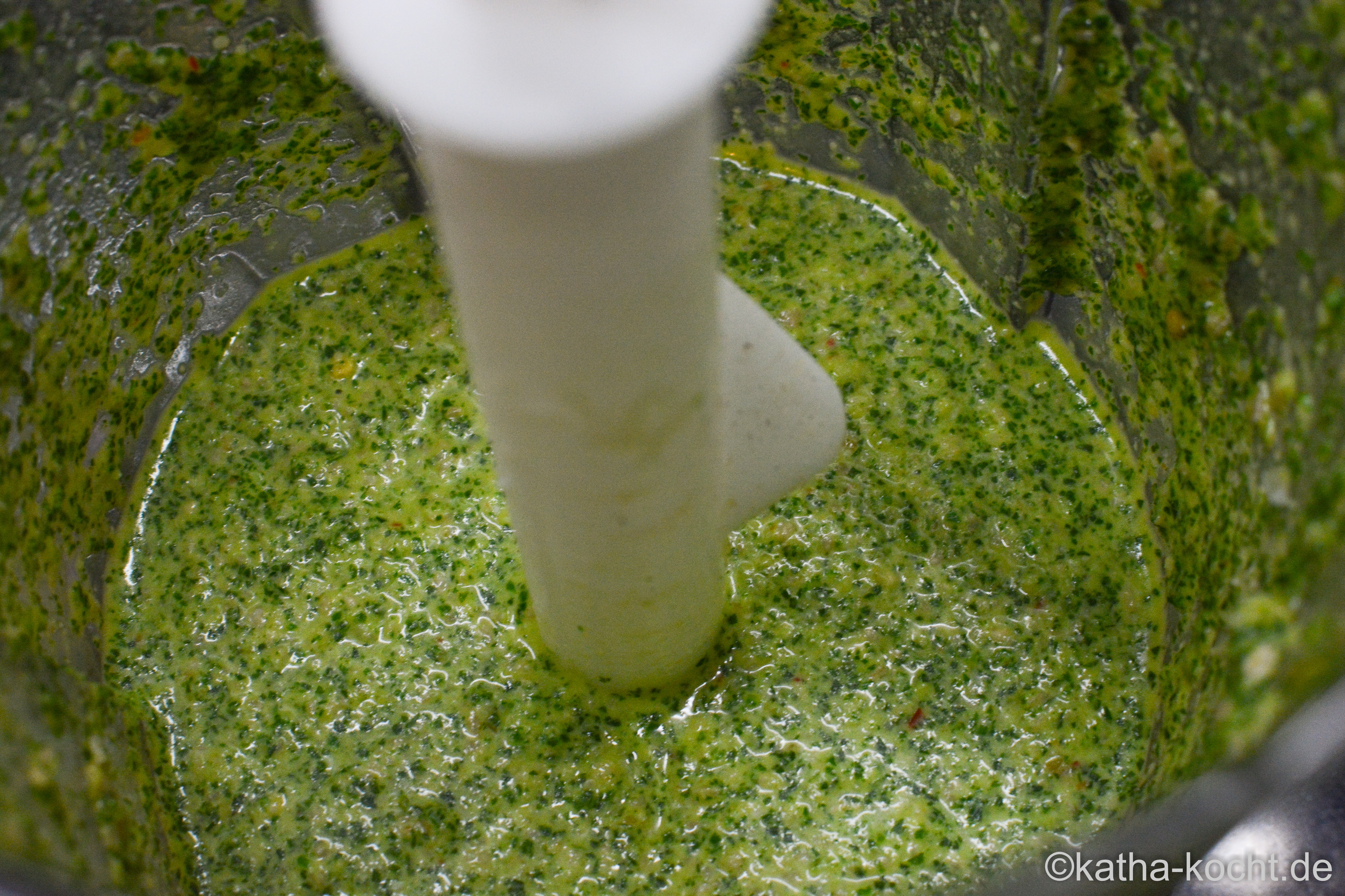 Den Rucola grob klein hacken, den Knoblauch schälen, die Chili in Ringe schneiden. Alles zusammen mit den Sonnenblumenkernen, dem fein geriebenem Parmesan, etwas Salz und Öl in einen kleinen Mixer* geben. Gegen Ende der Kochzeit für die Pasta einen guten Schluck vom Nudelwasser zufügen und alles zu einem feinen Pesto mixen. Ich nehme das Nudelwasser um etwas Öl einzusparen, so wird es etwas leichter. Ihr könnt aber auch Olivenöl dazu geben bis ihr die gewünschte Konsistenz habt.