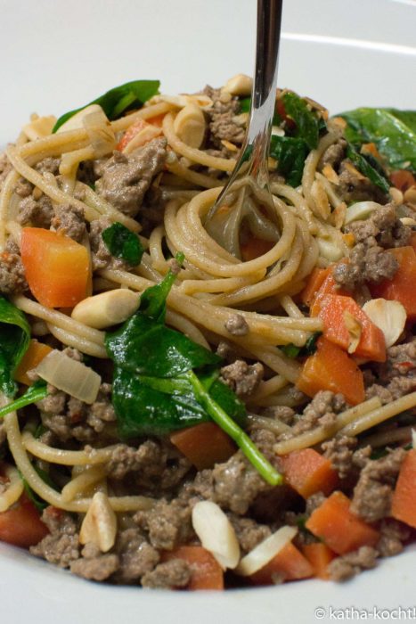 Am Ende kurz den Spinat in den Topf mit der Pasta geben und kurz blanchieren. Die Pasta samt Spinat abgießen und zurück in den Topf geben. Alles mit dem Hackfleisch und den Karotten vermengen. Die Nudeln ein letztes Mal mit Pfeffer und Salz abschmecken und die Spaghetti mit Tartar und buntem Gemüse auf zwei passende Pastateller* verteilen. Die gehackten Mandel darüber geben und die Pasta sofort servieren.