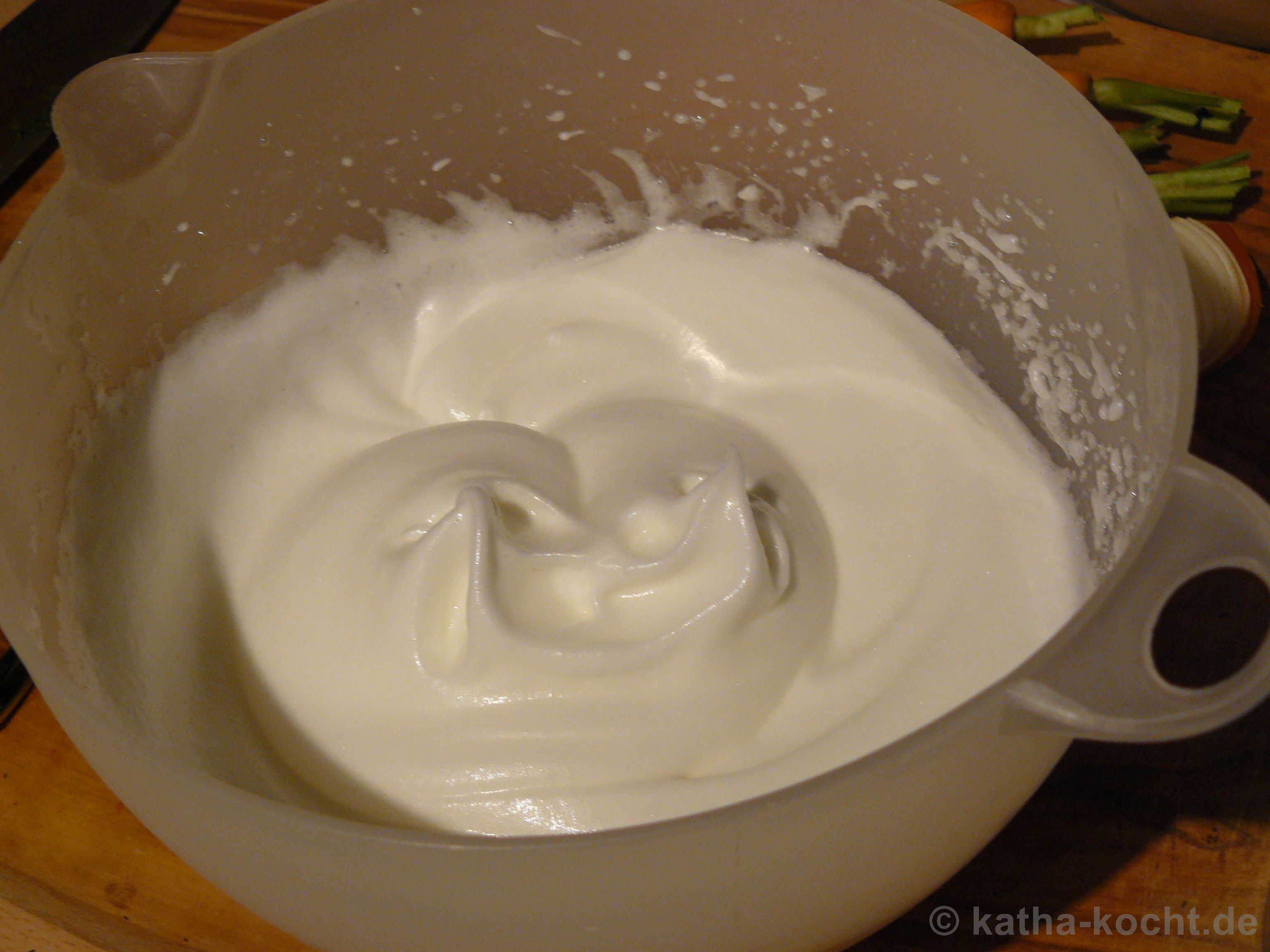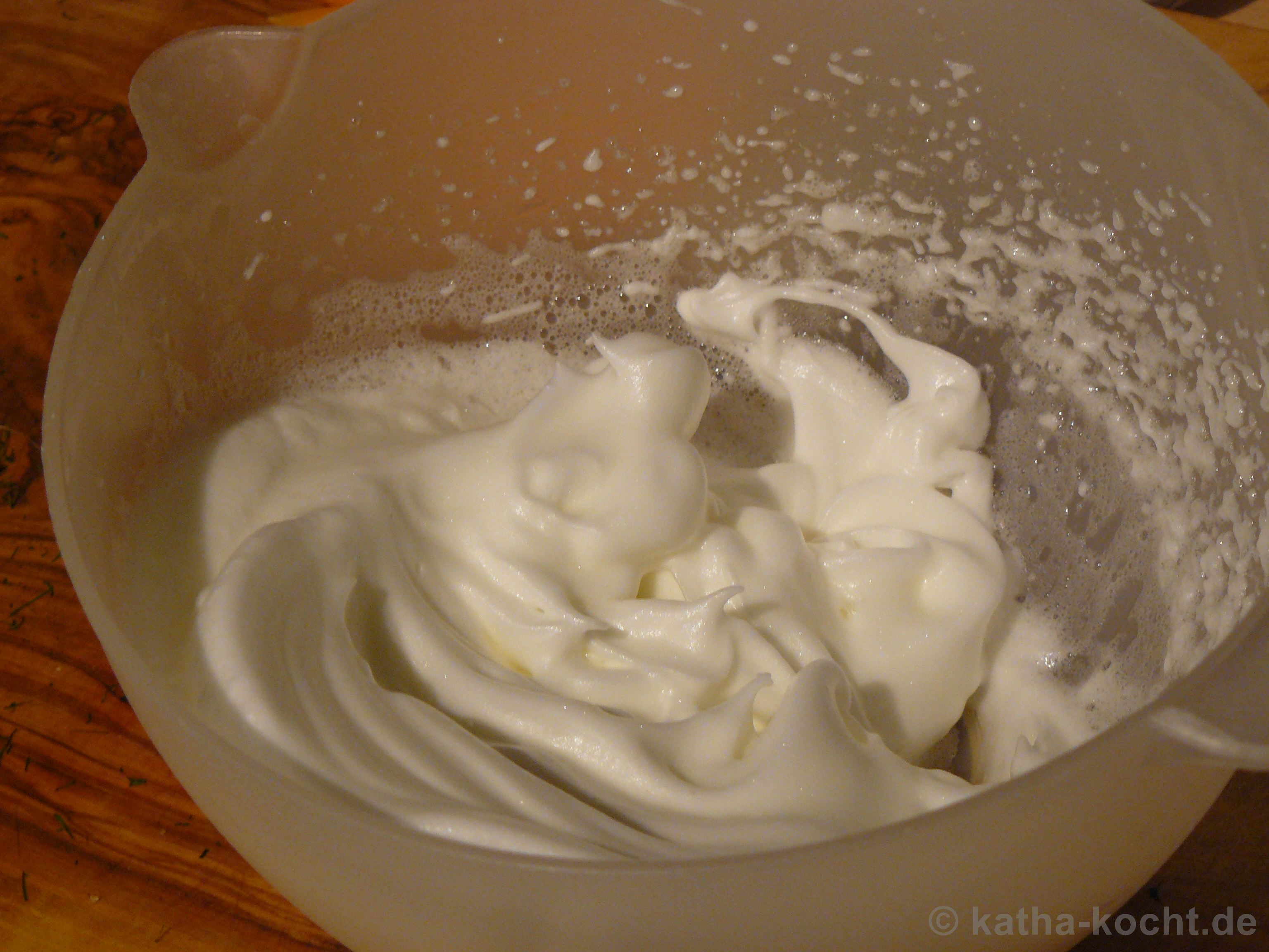 Trennen wir zunächst mal die Eier. Die Eigelb kommen in den Kühlschrank, ich mache später eine Carbonara daraus, das Eiweiß schlage ich mit Hilfe meines Handrührgerätes zusammen mit einer kleinen Prise Salz steif.