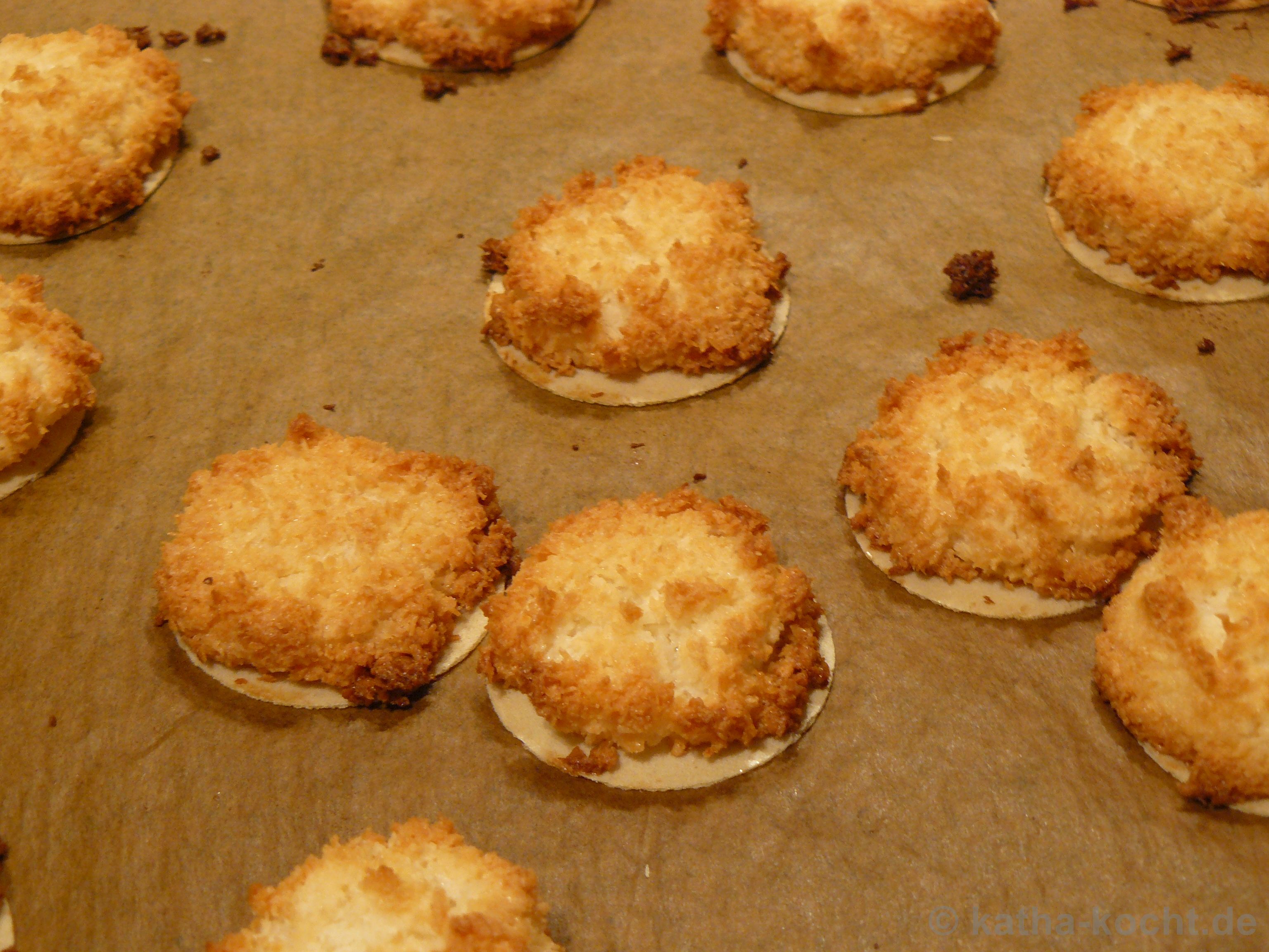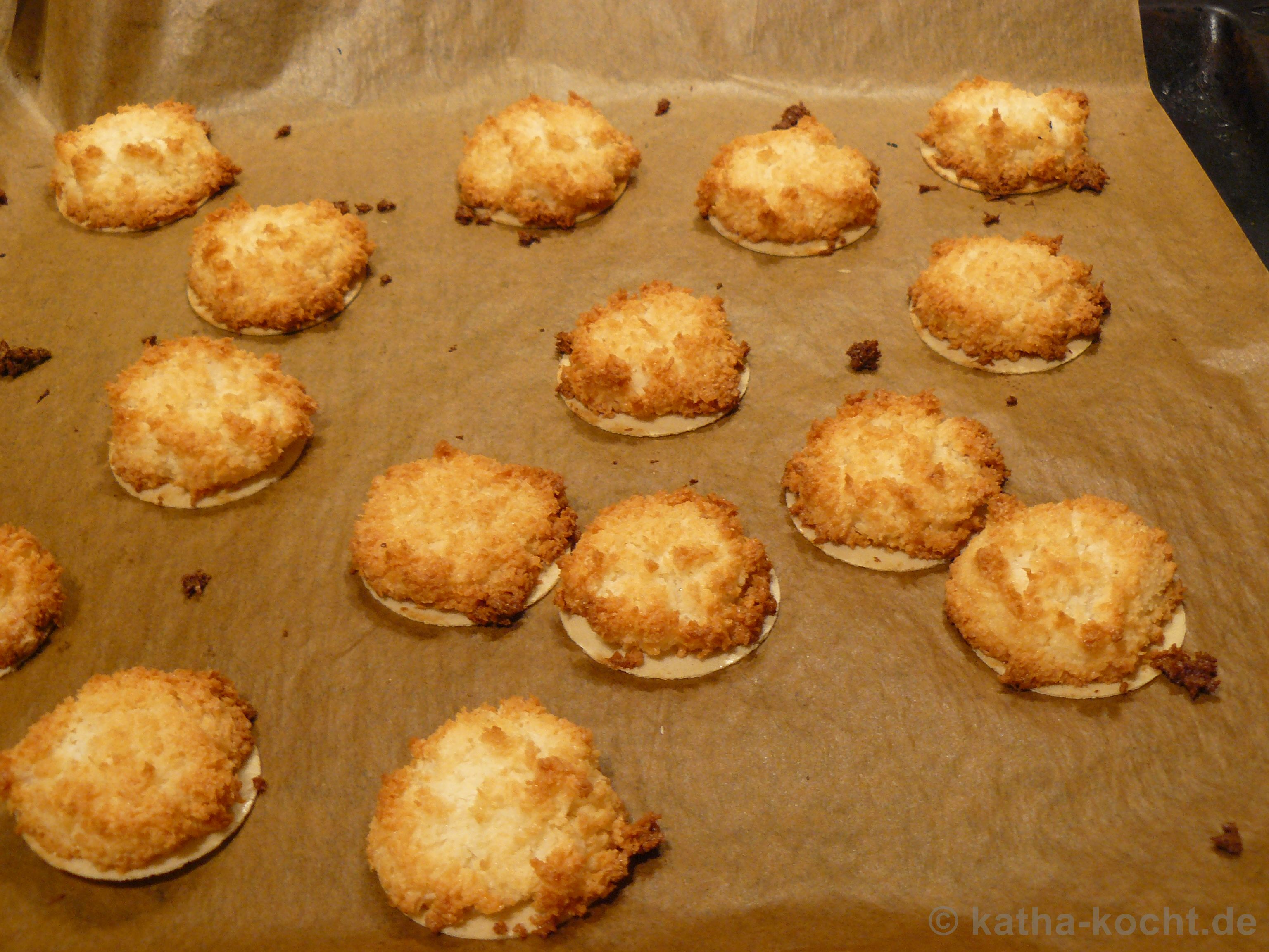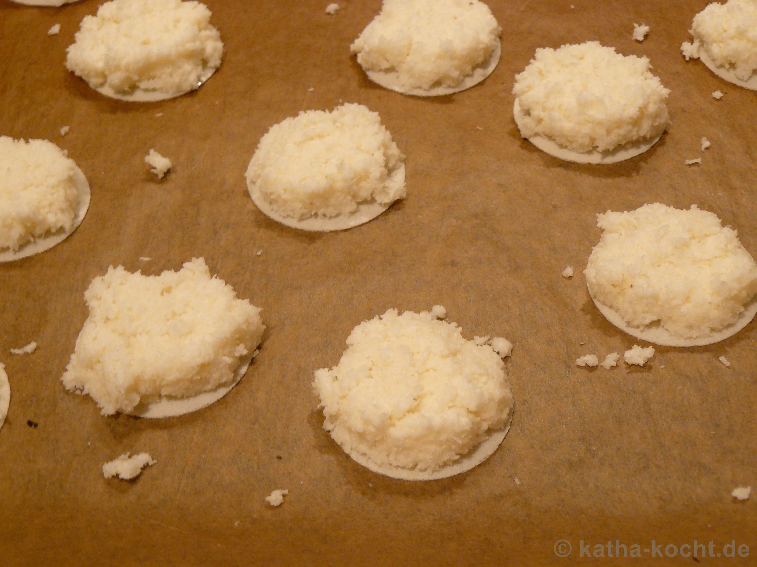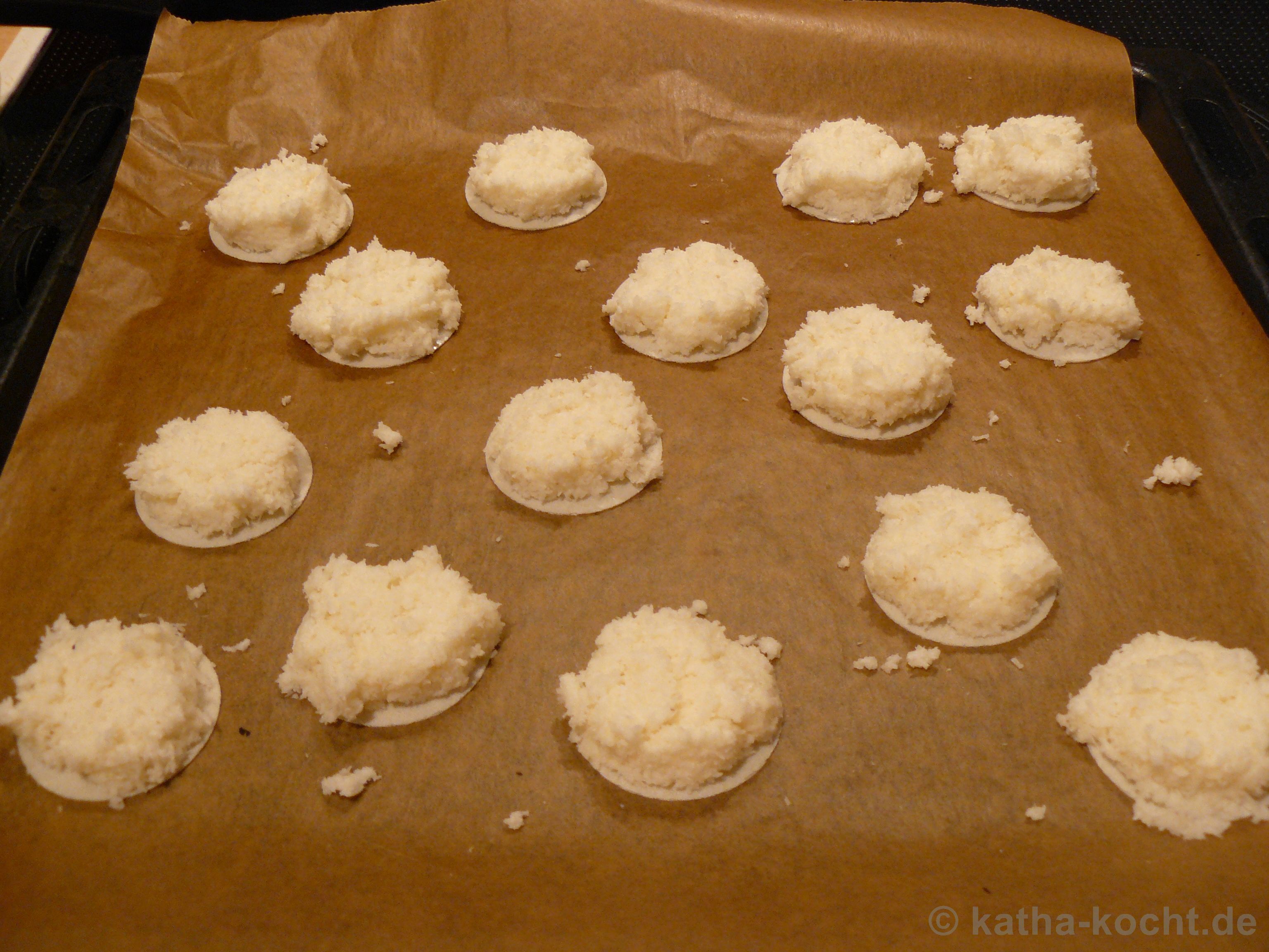 Als nächstes wird der Ofen auf 175°C vorgeheizt. Dann lege ich auf einem Blech mit Backpapier die Oblaten aus und setze auf jede einen gehäuften Teelöffel Kokosmasse. Die drücke und schiebe ich so zurecht, dass die Oblaten mehr oder weniger komplett bedeckt sind.