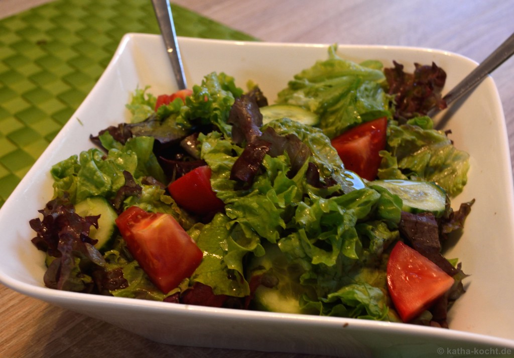 Für den Salat wasche ich die drei kleinen Salatköpfe und schneide die Salatblätter klein. Die Tomaten würfeln und die Gurke in dünne Scheiben schneiden. Mit Steinpilzöl (oder einem anderen Öl) und Apfelessig anmachen und mit Pfeffer, Salz und einer guten Prise Zucker würzen.